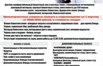 Тип ресторана: Ресторанный комплекс Расположение: В центре города Кухня: Европейская Возможность проведения фейерверка: Нет Можно ли со свое...